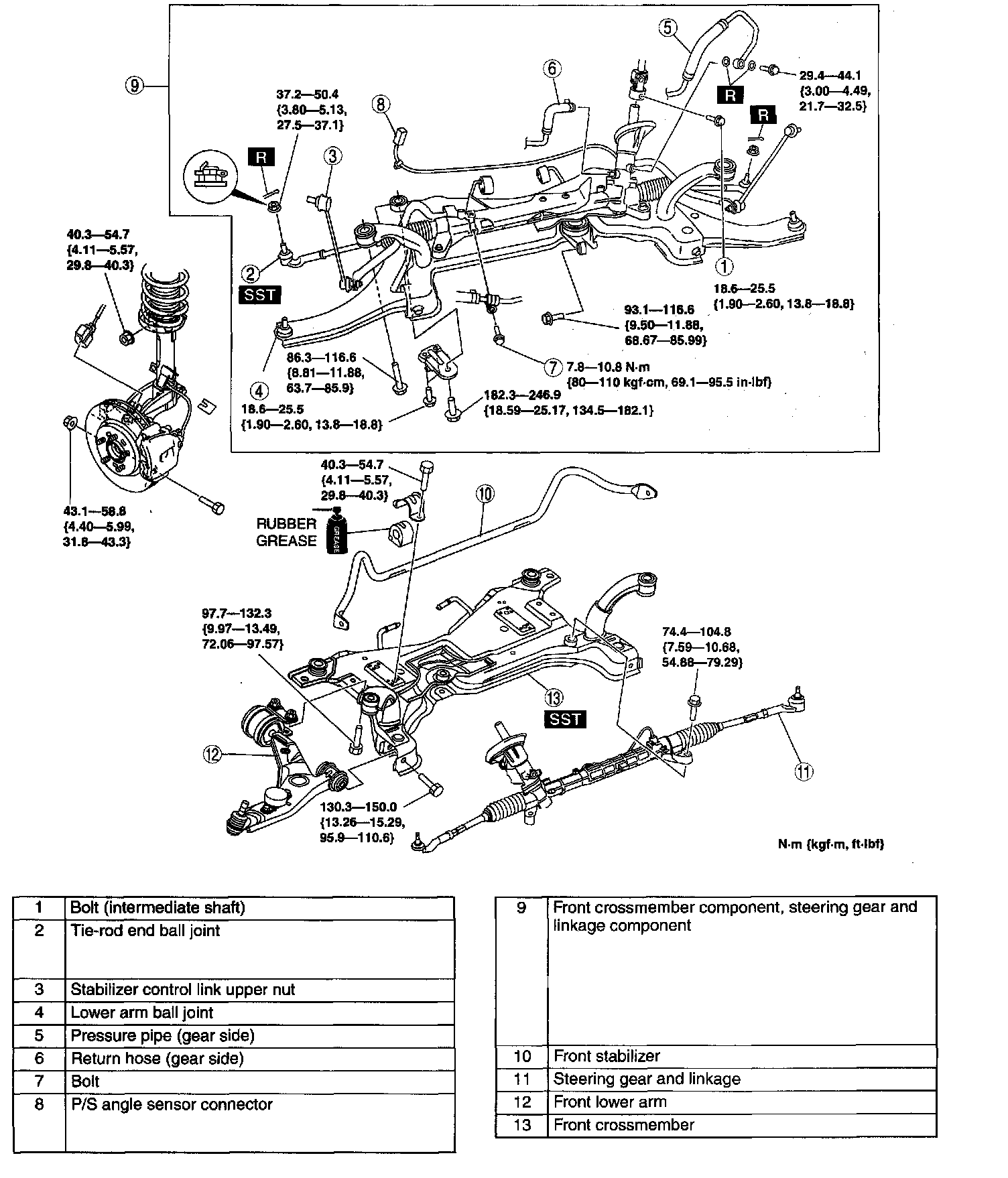 FRONT CROSSMEMBER REMOVAL/INSTALLATIONCaution: Performing the following procedures without first removing the ABS wheel-speed sensor may possibly cause an open circuit in the wiring harness if it is pulled by mistake. Before performing the following procedures, disconnect the ABS wheel-speed sensor wiring harness connector (axle side) and fix the wiring harness to an appropriate place where it will not be pulled by mistake while servicing the vehicle.