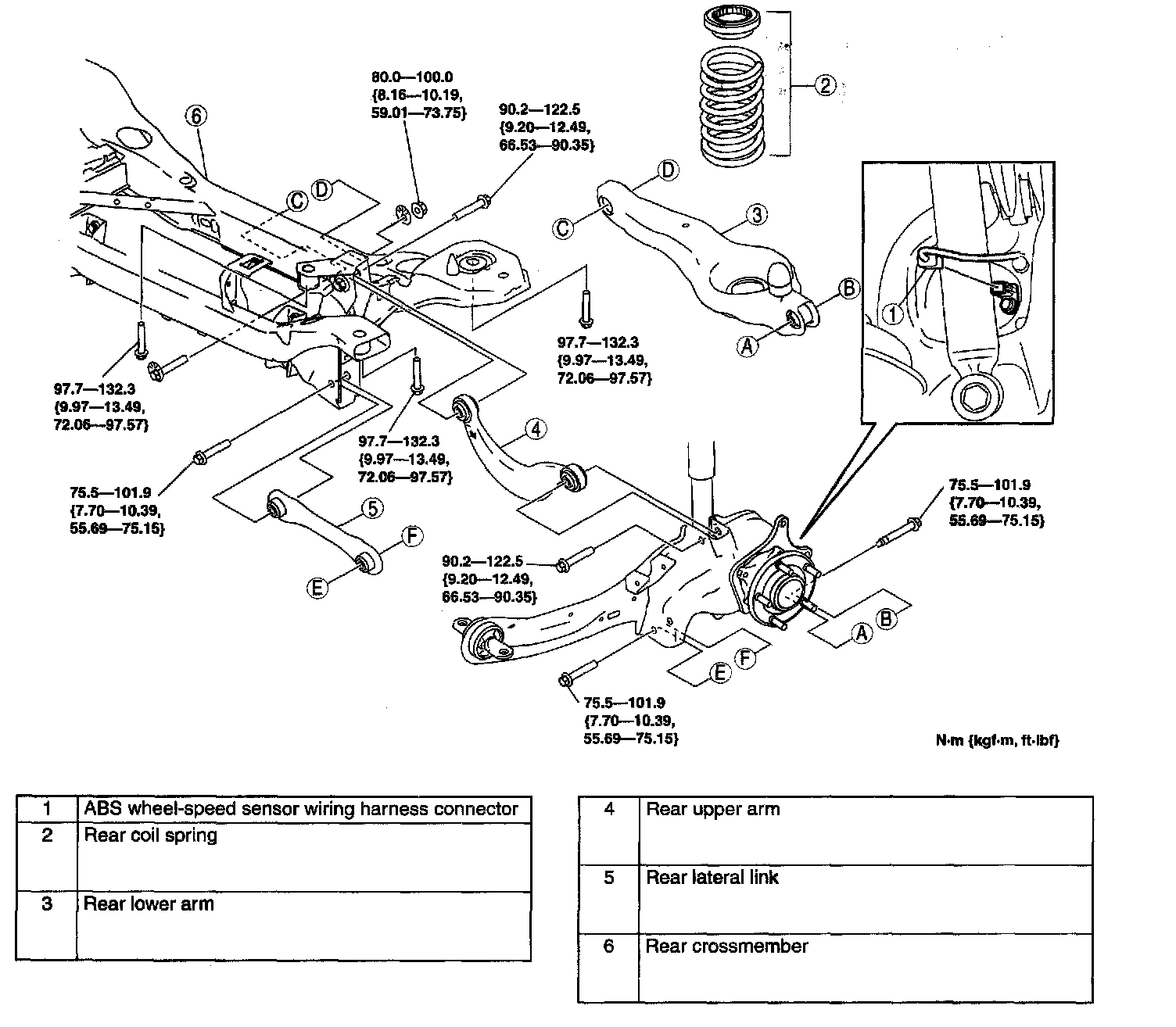 REAR CROSSMEMBER REMOVAL/INSTALLATIONCaution: Performing the following procedures without first removing the ABS wheel-speed sensor may possibly cause an open circuit in the wiring harness if it is pulled by, mistake. Before performing the following procedures, disconnect the ASS wheel-speed sensor wiring harness connector (axle side) and fix the wiring harness to an appropriate place where it will not be pulled by mistake while servicing the vehicle.