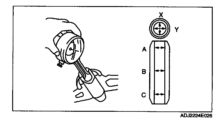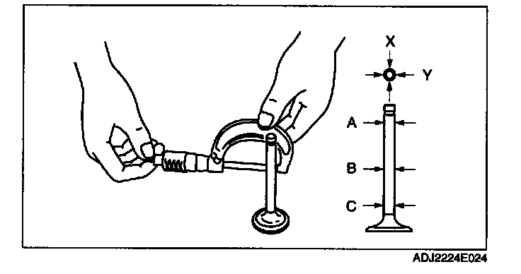 3. Measure the stem diameter of each valve in X and Y directions at the three points (A, B, and C) as indicated in the figure. If it exceeds the specification, replace the valve.