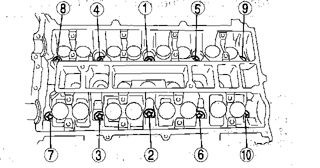 1. Tighten the cylinder head bolts in the order indicated in the figure in 5 steps using the SST (49 D032 316).