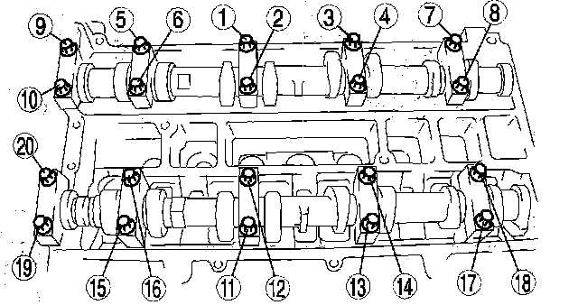 3. Tighten the camshaft cap bolt in the order shown two steps.