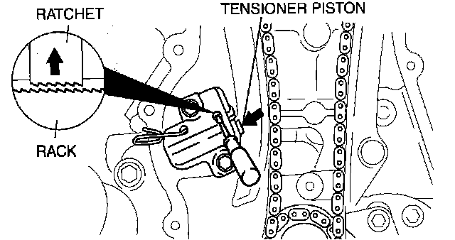 3. Hold the chain tensioner piston with a 1.5 mm {0.06 inch} wire or paper clip.