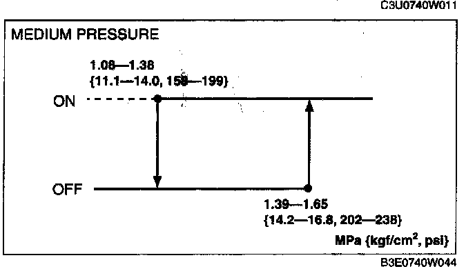 3. Verify the high-pressure side reading of the SST (manifold gauge) and continuously between the refrigerant pressure switch terminals B and C, A and D.