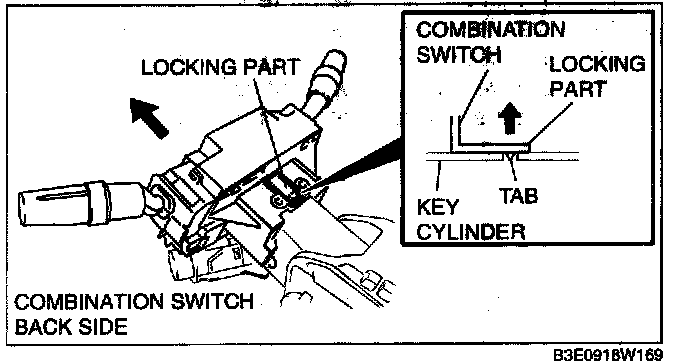 1. Pull the combination switch locks in the direction indicated in the figure and disengage the tab