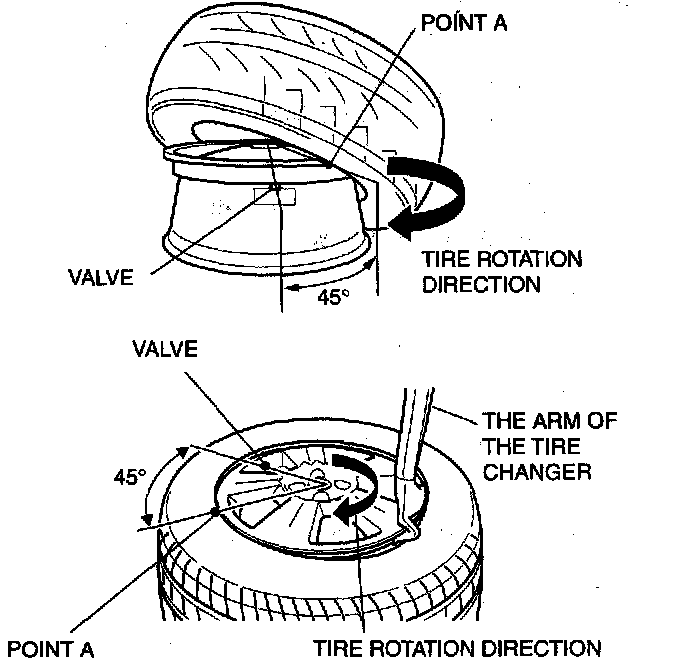 3. Set the tire changer so that it is 450 away (point A) from the valve hole.