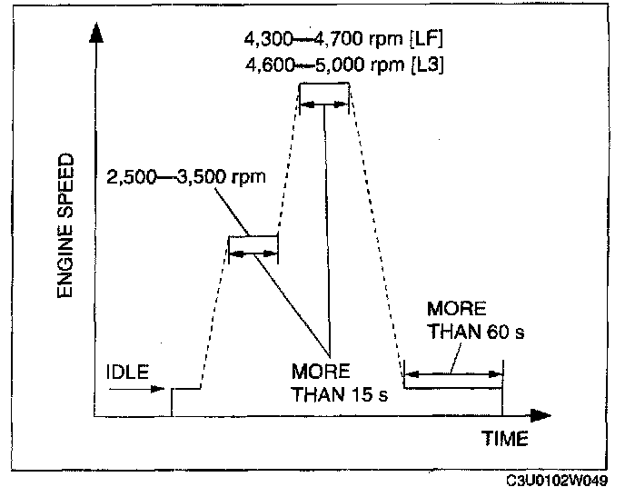 3. Perform no load racing at the engine speed shown in the graph, then idle the engine for more than 60 s after the cooling fan has stopped. If possible, monitor RPM PID for engine speed during this procedure.