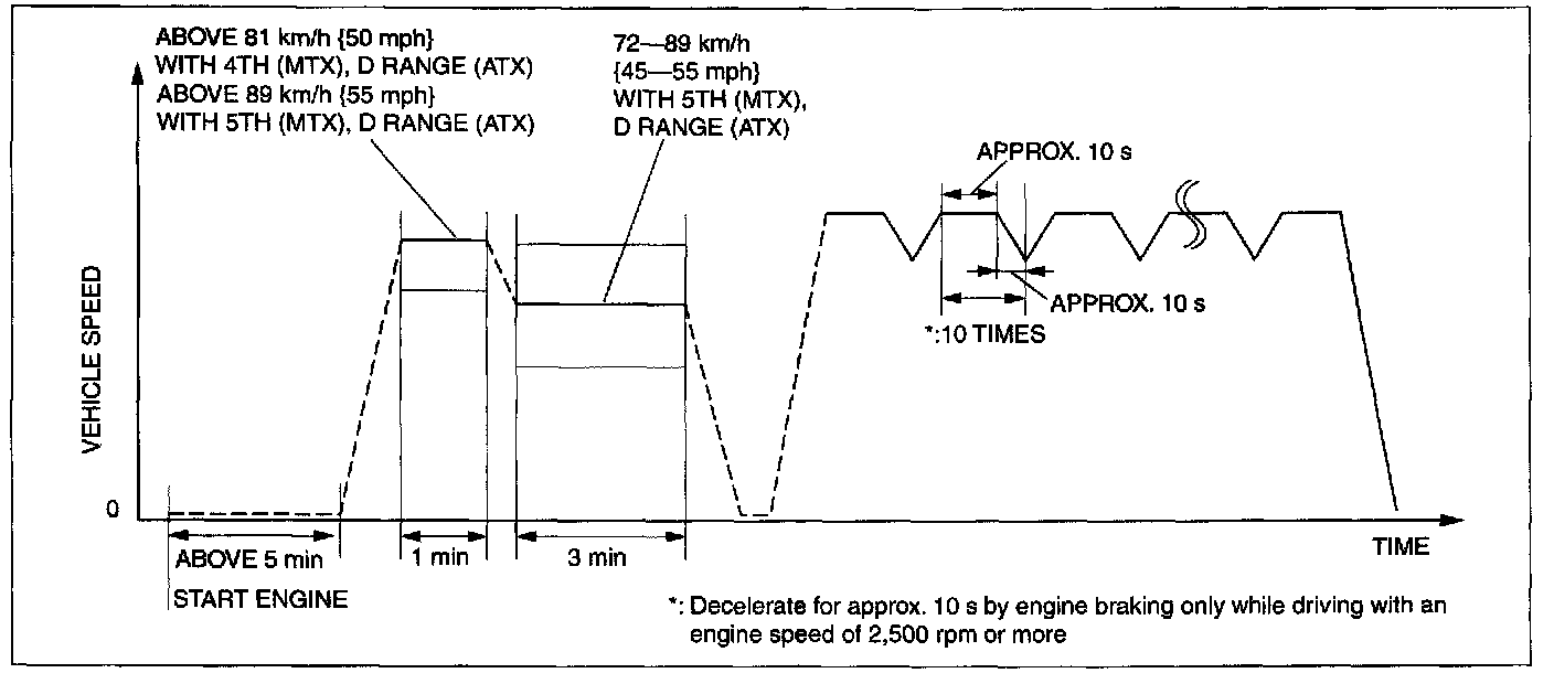 6. Drive the vehicle at an engine speed of 65 - 80 km/h {40 - 50 mph} for more than 5 min.