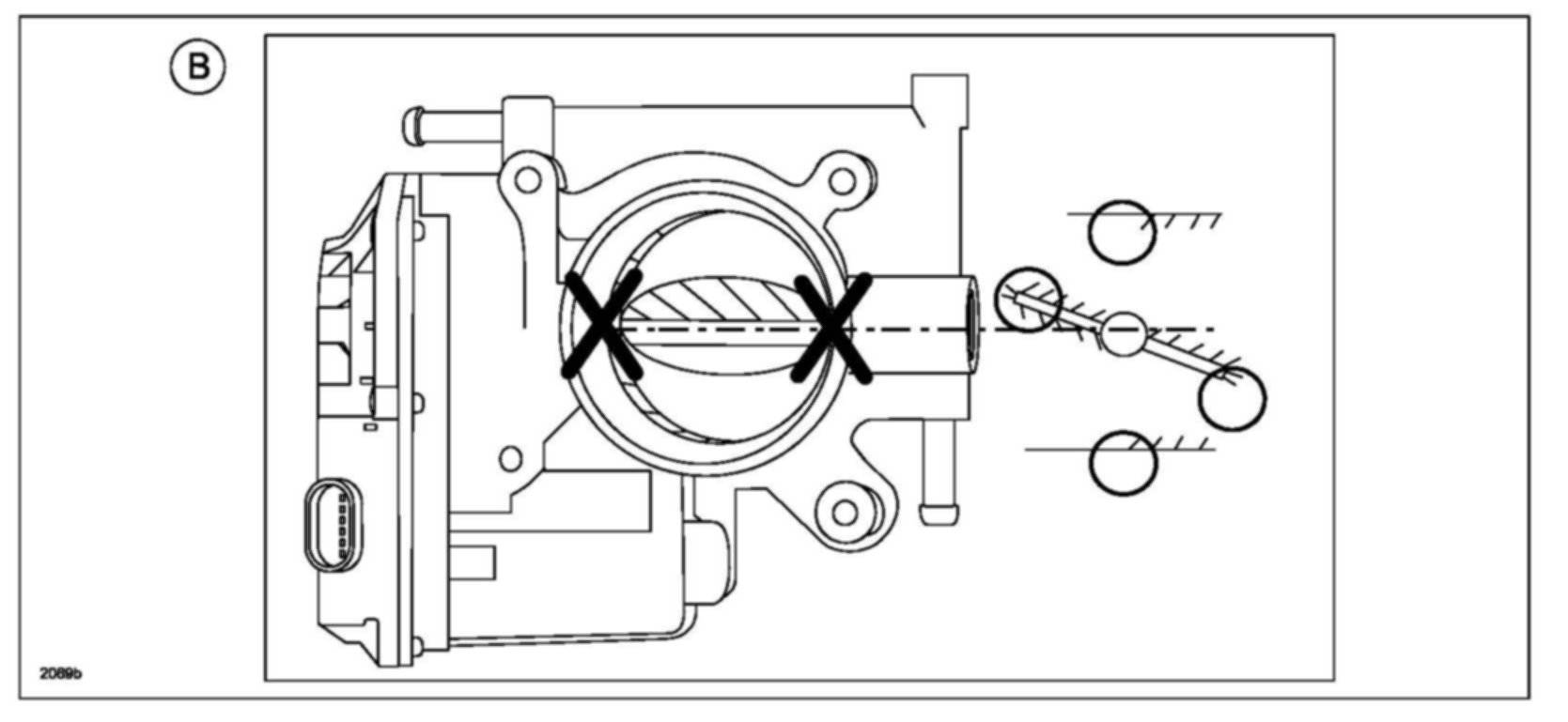 DO NOT spray the cleaner directly inside the throttle body and DO NOT wipe around the throttle valve shaft shown with an X.