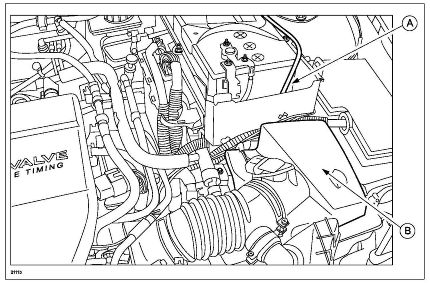 4. Remove the battery (A), battery tray and air cleaner (B) from the engine compartment.