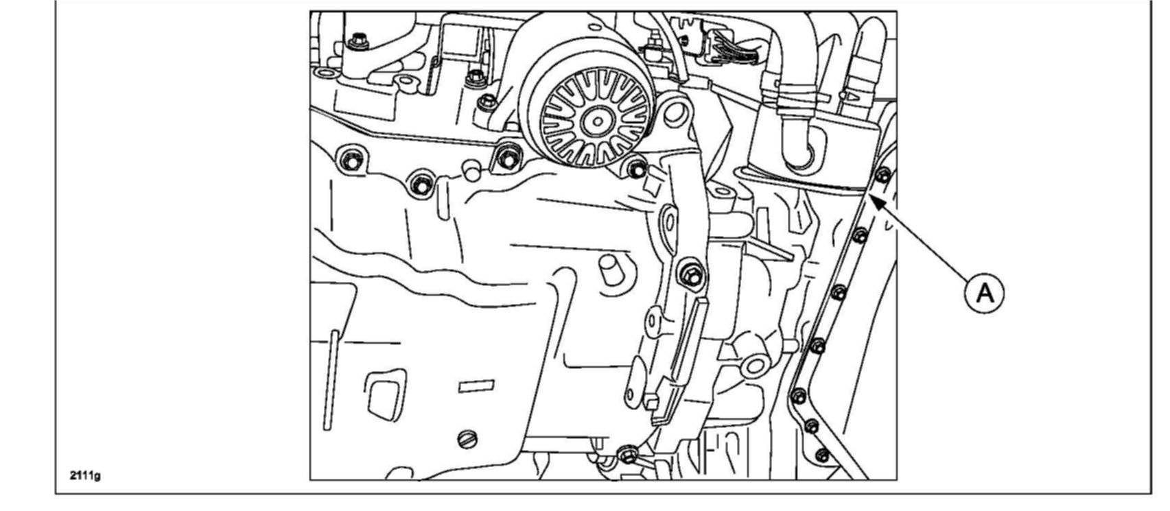 a. Apply a 2.5 mm bead down the center of the sides of the oil pan (A).
