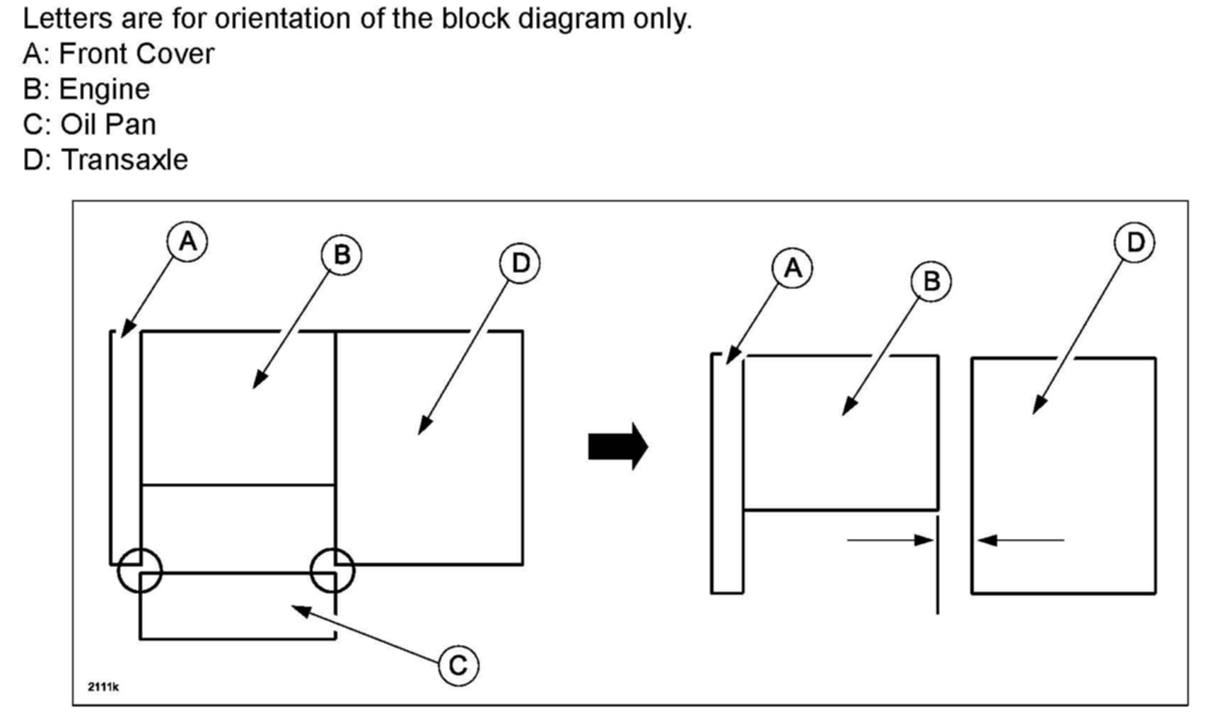 The thickness of liquid gasket tends to be thin because the clearance between the oil pan and the transmission and the front cover and transmission is almost zero during oil pan reinstallation. Allow 3 mm space maximum between the engine and transmission with the transaxle bolts loosened one full before reinstalling the oil pan.