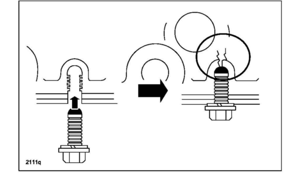 b. Install the front cover stud bolt directly under the crank pulley lock bolt.
