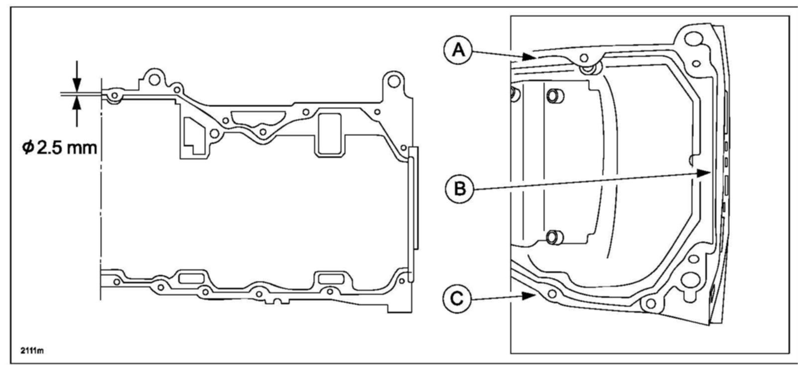 b. Apply a 2.5 mm bead to the rear edge (B) of the oil pan (approximately 5mm from the rear edge).
