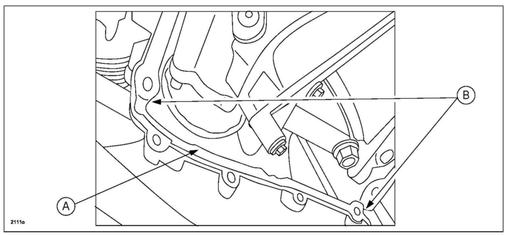 e. Apply an ample amount to the front cover where the oil pan is fitted (A), and also apply an extra amount (a ball of approximately 5 mm in diameter) of liquid gasket to the corners of the front case and the cylinder block (B).