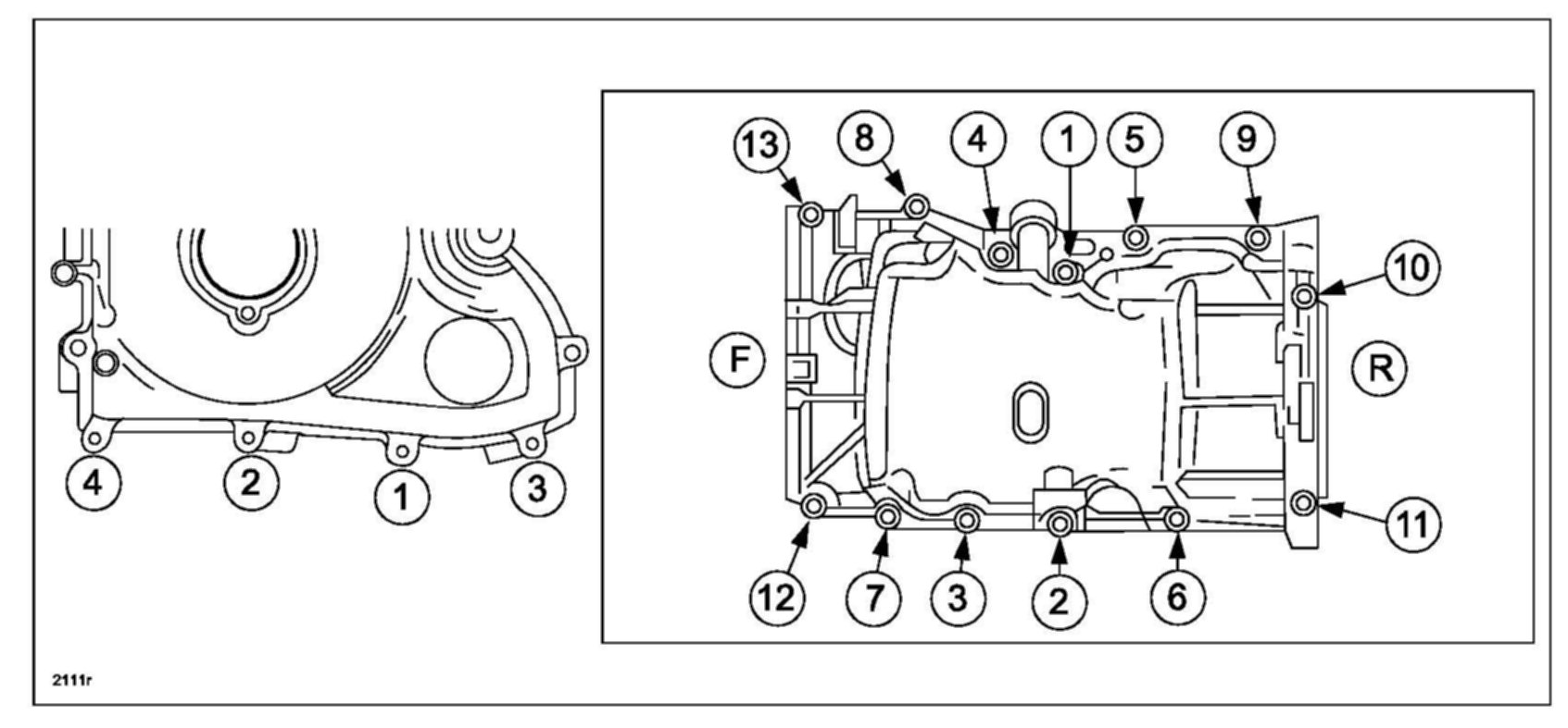 6. Install and tighten the oil pan bolts and front cover bolts as follows. The front of the engine is (F) and the rear of the engine is (R).