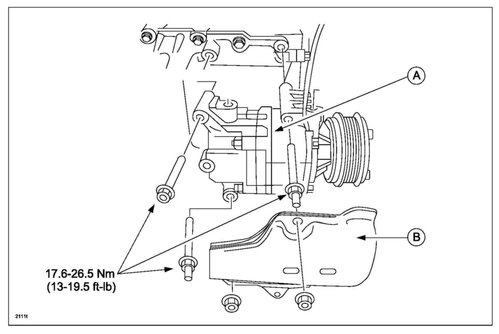 11. Remove the A/C compressor (A) after removing the protector (B).