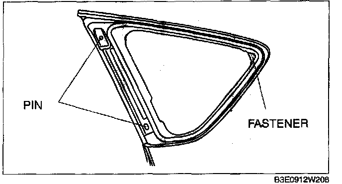 8. Press the areas where the pins are located on the quarter window glass to allow the pin tabs to be engaged with the body.