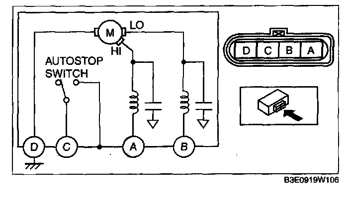2. Connect battery positive voltage to windshield wiper motor terminal A or B, and ground to terminal D, then verify that the windshield wipers operate as shown in the table.