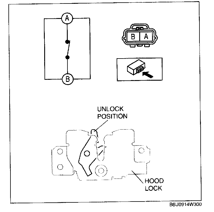 5. Inspect for continuity between the hood switch terminals A and B using an ohmmeter.