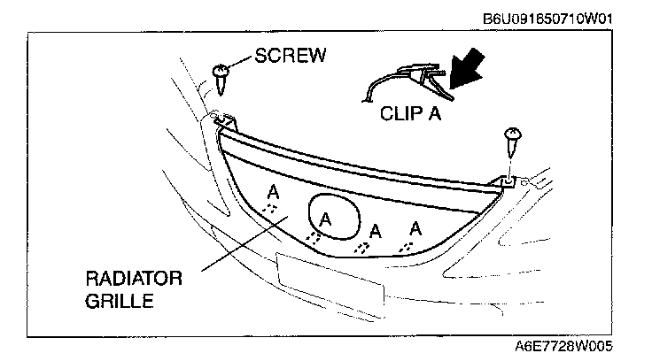 Press clips A in the direction of the arrow, pull the radiator grille outward, and remove it from the front