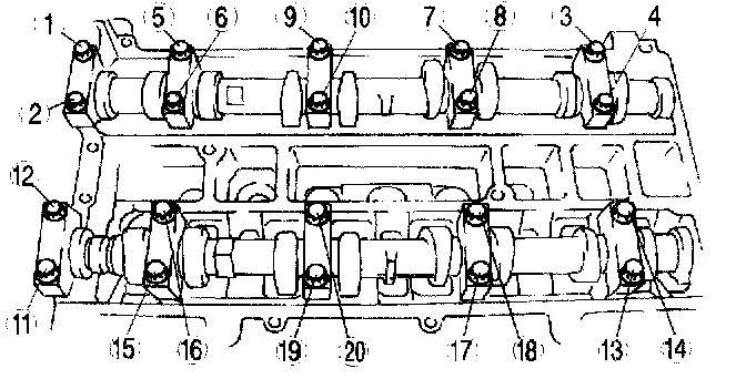1. Loosen the camshaft cap bolts in two or three steps in the order shown in the figure.