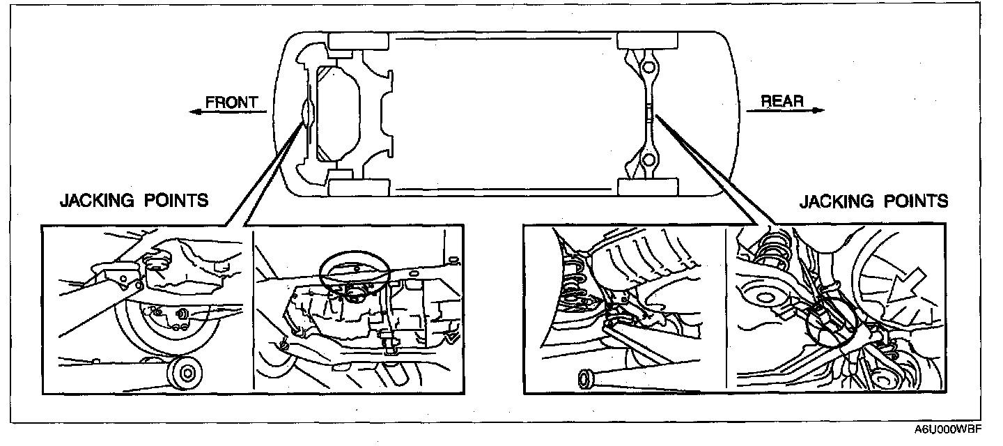 JACKING POSITIONS, VEHICLE LIFT (2 SUPPORTS) AND SAFETY STAND (RIGID RACK) POSITIONSJacking Positions