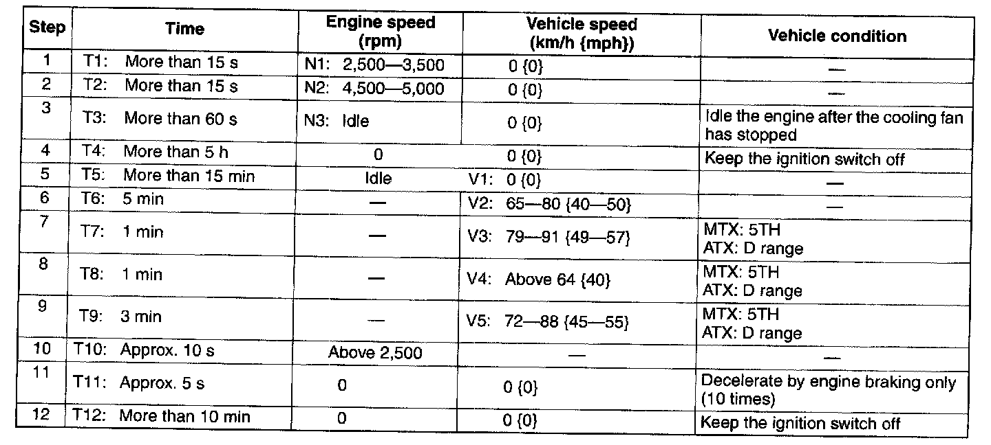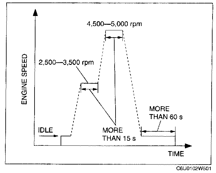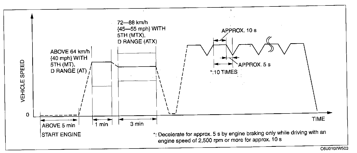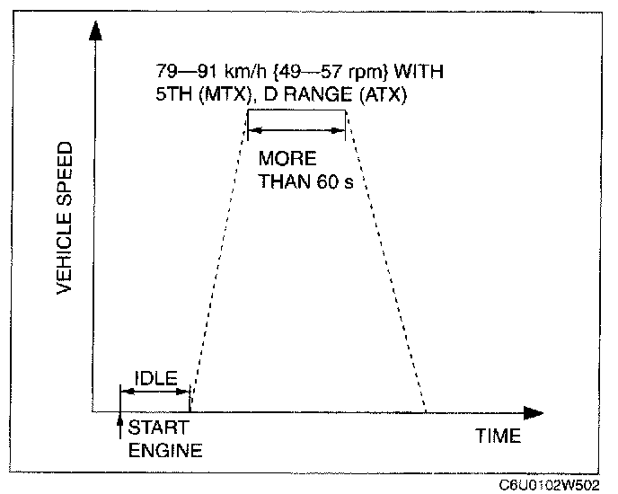 6. Drive the vehicle at an engine speed of 65 - 80 km/h {40 - 50 mph} for more than 5 min.