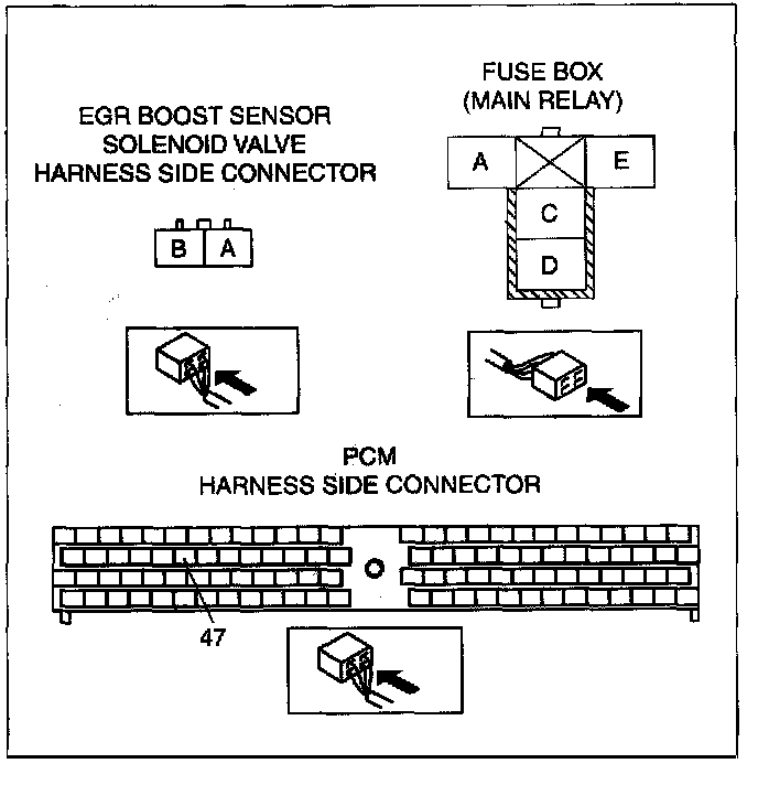 - EGR boost sensor solenoid valve terminal B (harness-side) and PCM terminal 47