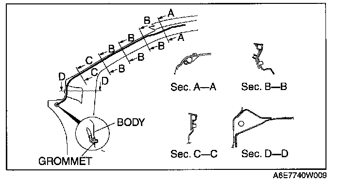 4. Insert the front drain hose grommet into the hinge pillar inner hole.