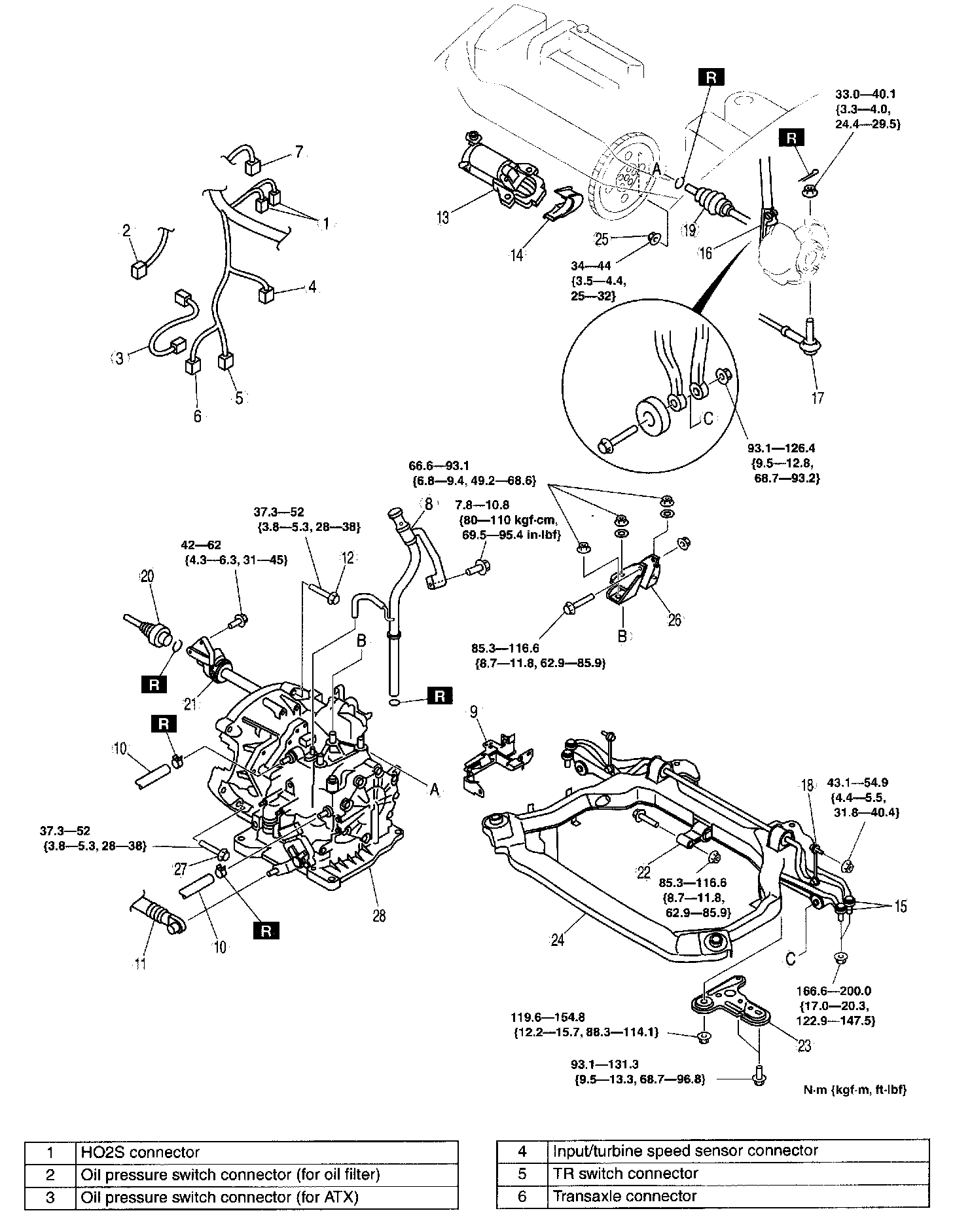 A, B, C: 66.6 - 93.1 Nm (6.8 - 9.4 kgf-m, 49.2 - 68.6 ft. lbs.)
