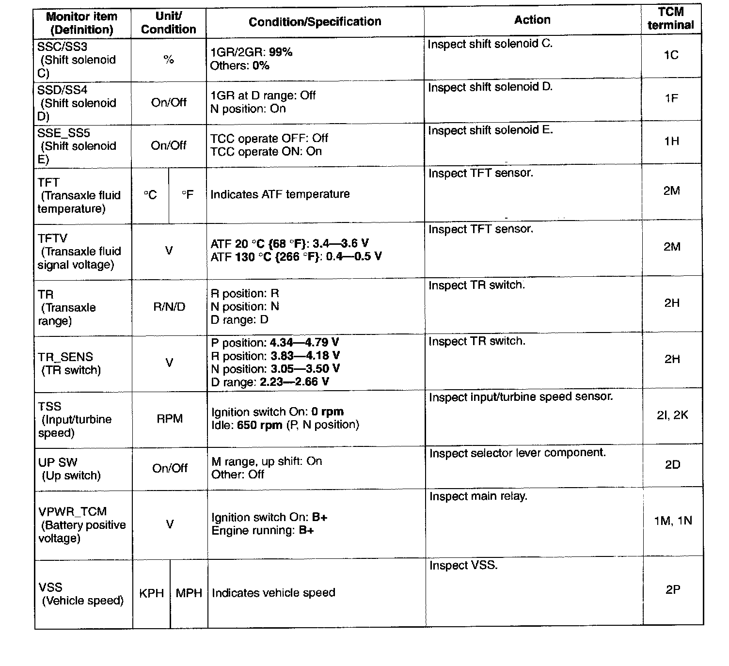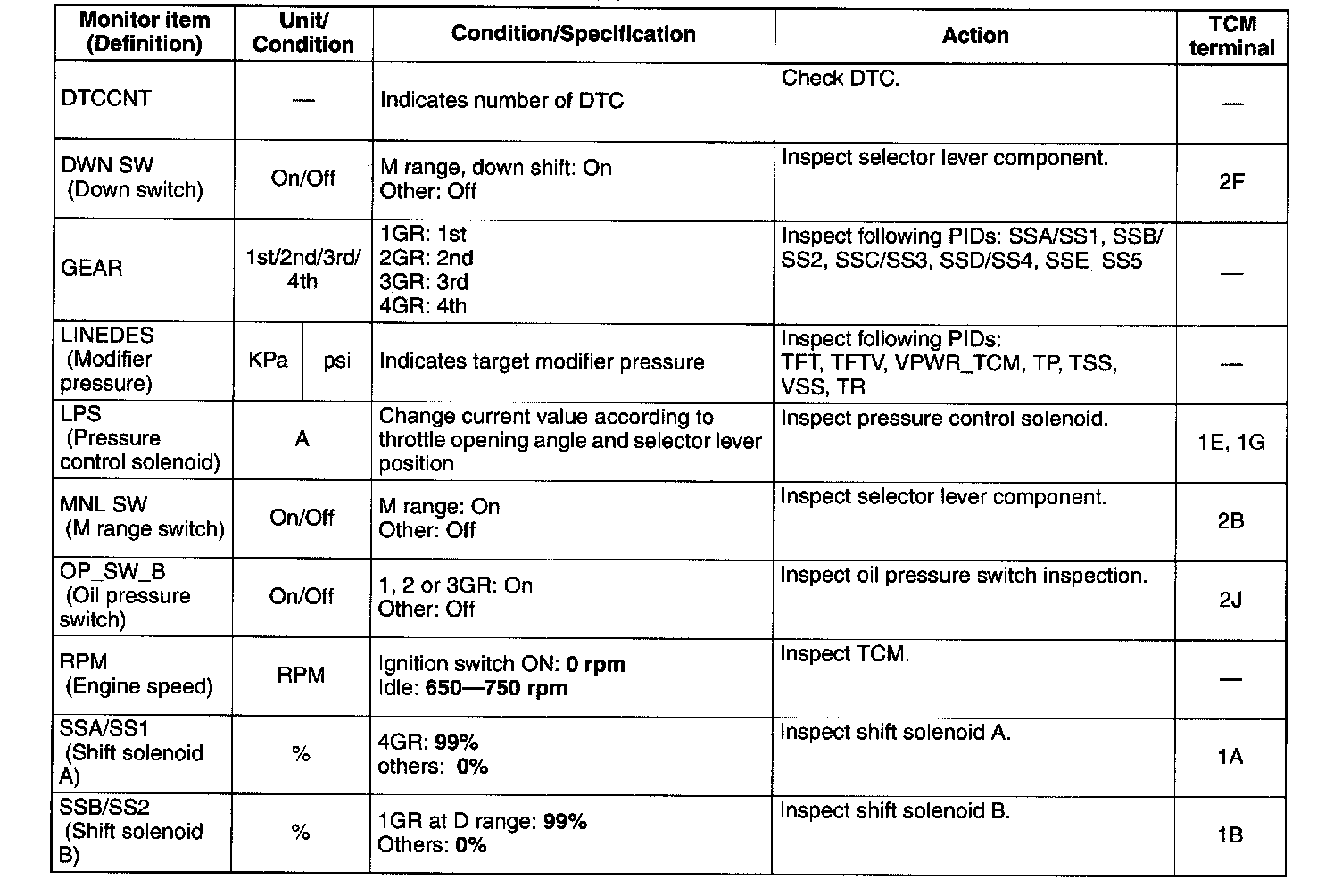 ^ The PID/DATA MONITOR function monitors the calculated value of the input/output signals in the TCM. Therefore, if a monitored value of an output device is out of specification, it is necessary to inspect the monitored value of the input device related to the output device control. Since an output device malfunction is not directly indicated as a malfunction of the monitored value for the output device, it is necessary to inspect the output device individually using the simulation function.