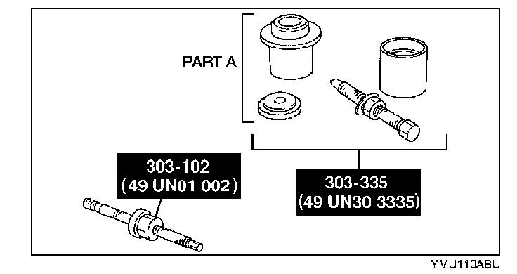3. Assemble the front oil seal using part A of the SST [303-335 (49 UN30 3335)] and the SST [303-102 (49 UN01 002)] in the following order.