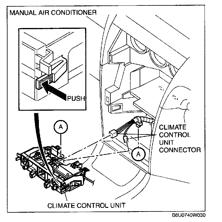 6. Disconnect the climate control unit connectors and remove the climate control unit, (Manual air conditioner)