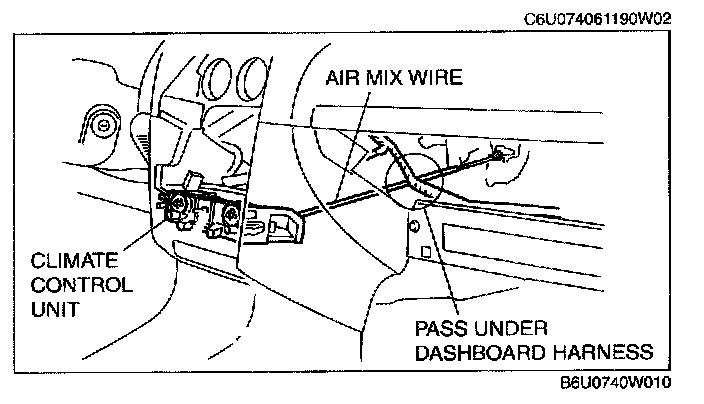1. Pass air mix wire through the following routes then connect to A/C unit. (Manual air conditioner)