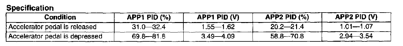 5. Verify that the APP1 or APP2 PID (percentage) is as indicated in the table given according to the condition of the accelerator pedal