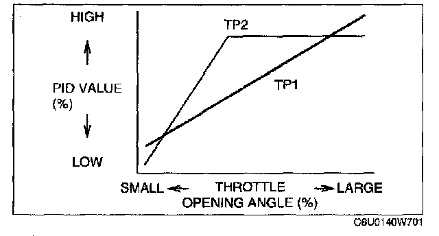 6. Operate the accelerator pedal and verify that the TP1 or TP2 PID (percentage) changes as shown in the given graph.