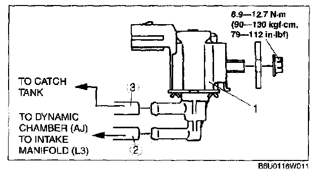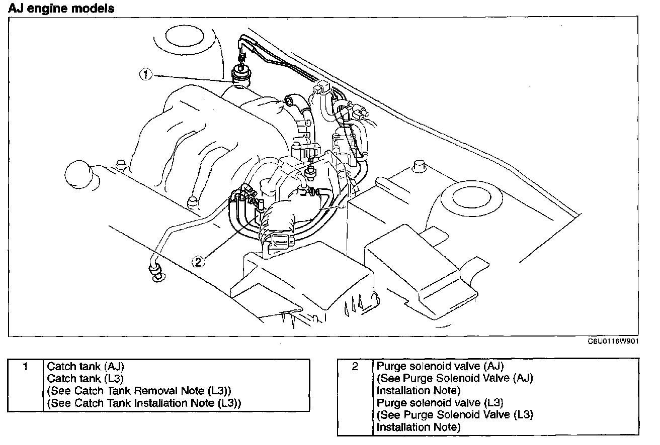 - For California emission regulation applicable model, refer to the "Evaporative Hose Removal Note" to disconnect evaporative hose (to the fuel tank) from the charcoal canister. (See Evaporative Hose Removal Note (Type B).)
