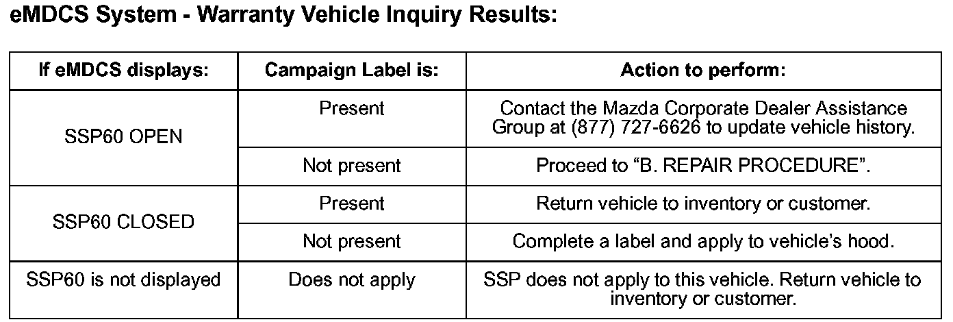 2. Perform a Warranty Vehicle Inquiry using your eMDCS System and inspect vehicle for an Authorized Modification Label SSP60 attached to the vehicle's hood. Refer to eMDCS System - Warranty Vehicle Inquiry Results table shown.