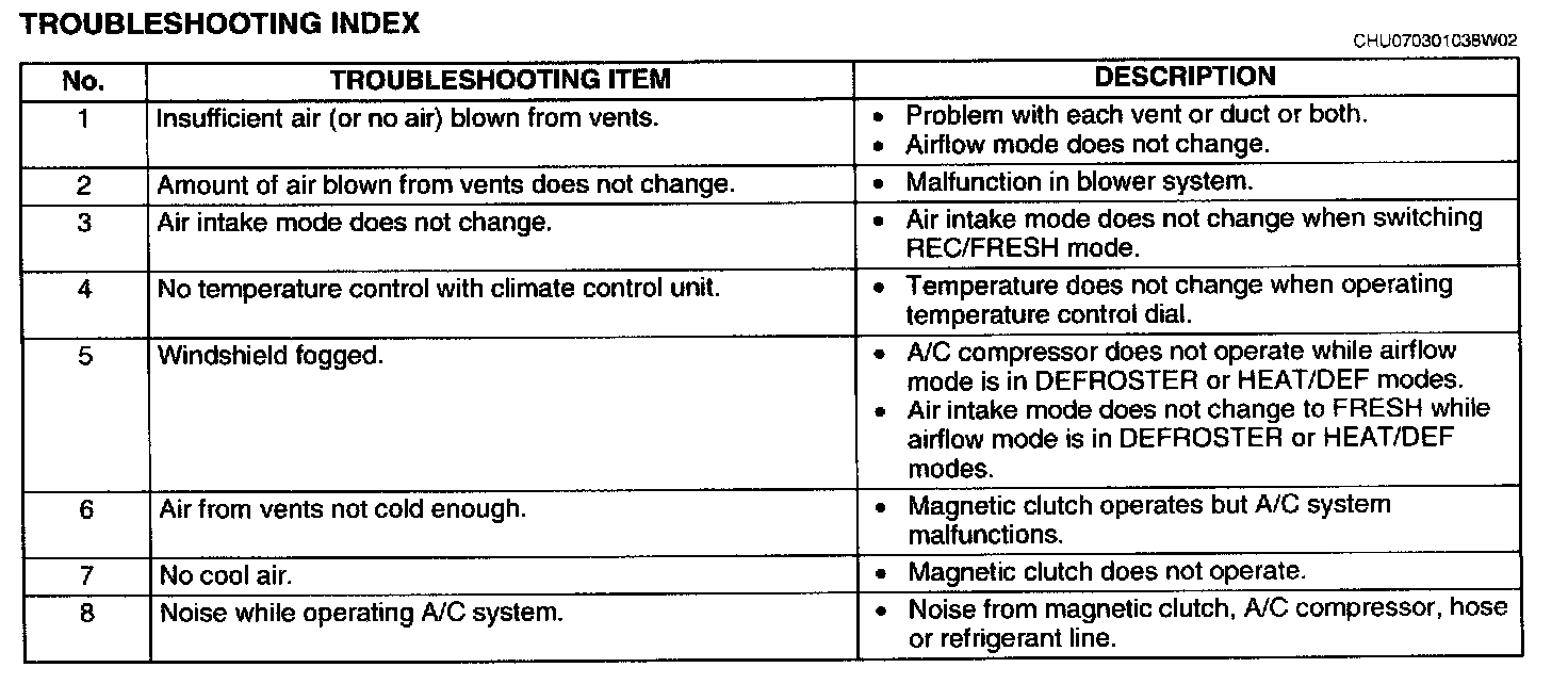 The areas for inspection (steps) are given according to various circuit malfunctions. Use the given chart to verify the symptoms of the trouble in order to diagnose the appropriate area.