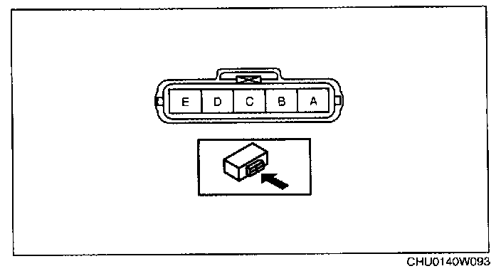 2. Verify that the resistance between MAF sensor terminals D and E is as indicated in the table while blowing hot air gradually into the IAT sensor part built into the MAF sensor.