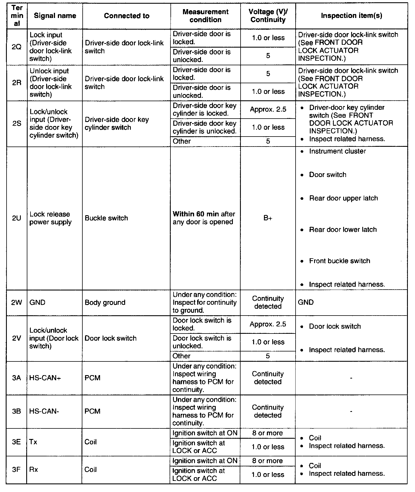 KEYLESS CONTROL MODULE INSPECTION1. Measure the voltage or inspect for continuity according to the Terminal Voltage Table (Reference).