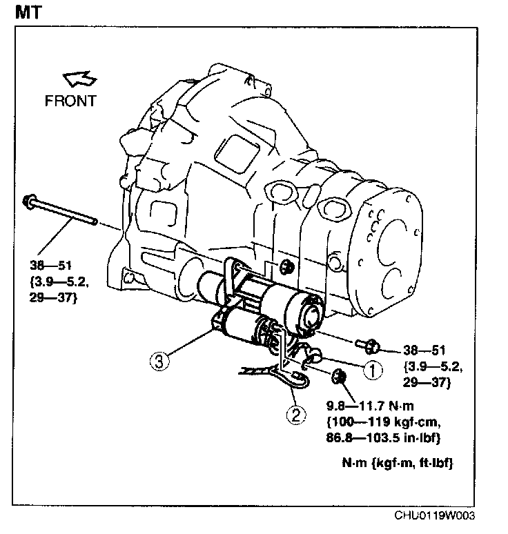 STARTER REMOVAL/INSTALLATIONWARNING: When the battery cables are connected, touching the vehicle body with starter terminal B will generate sparks. This can cause personal injury, fire, and damage to the electrical components. Always disconnect the negative battery cable before performing the following operation.
