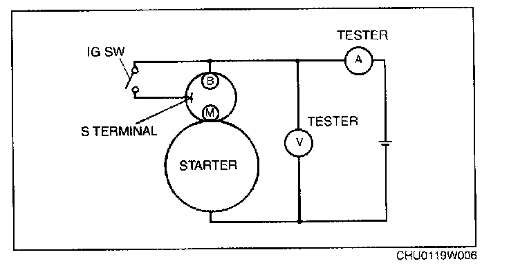 2. Connect the starter, battery, and a tester as shown in the figure.
