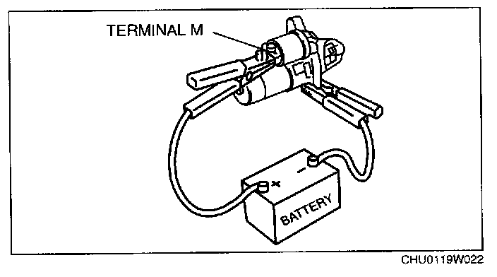 2. Connect battery positive voltage to terminal M and ground the starter body.