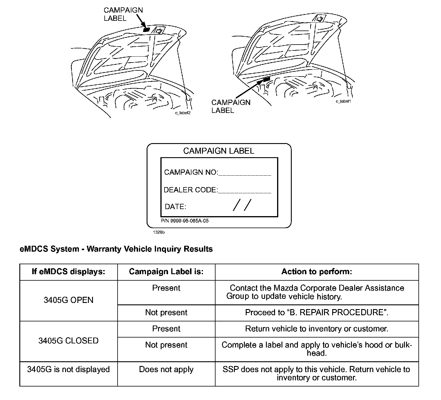 Complete a "Campaign Label" with the Recall number written on the sticker and affix it to the vehicle's hood or bulkhead. Refer back to the illustration under "A. VEHICLE INSPECTION PROCEDURE".