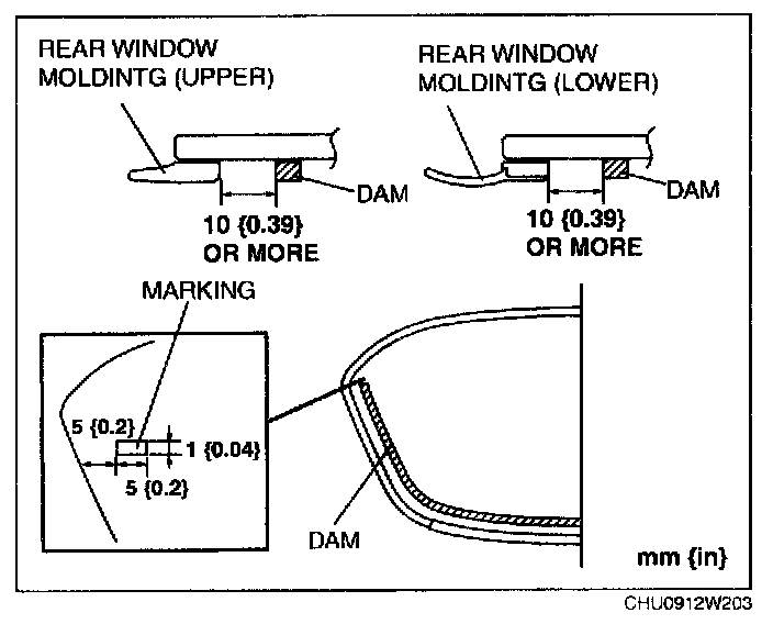 8. Position the marking on the rear window glass and the curved line of the body (roof molding) left and right so that they are aligned.