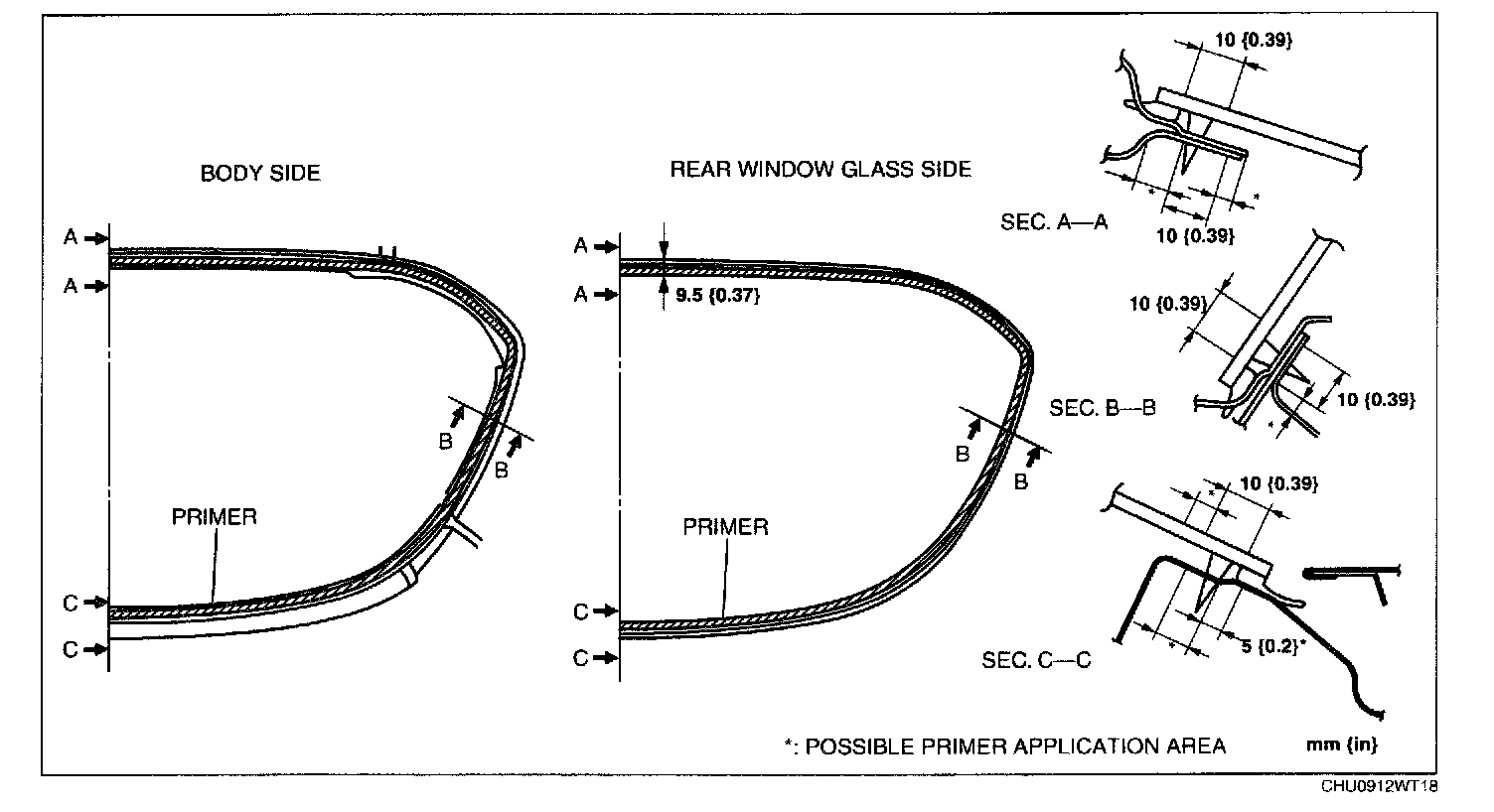CAUTION: Keep the area free of dirt, water and grease, and do not touch the surface. Otherwise, the primer may not properly bond to the surface of the glass and body, causing leaks to occur.
