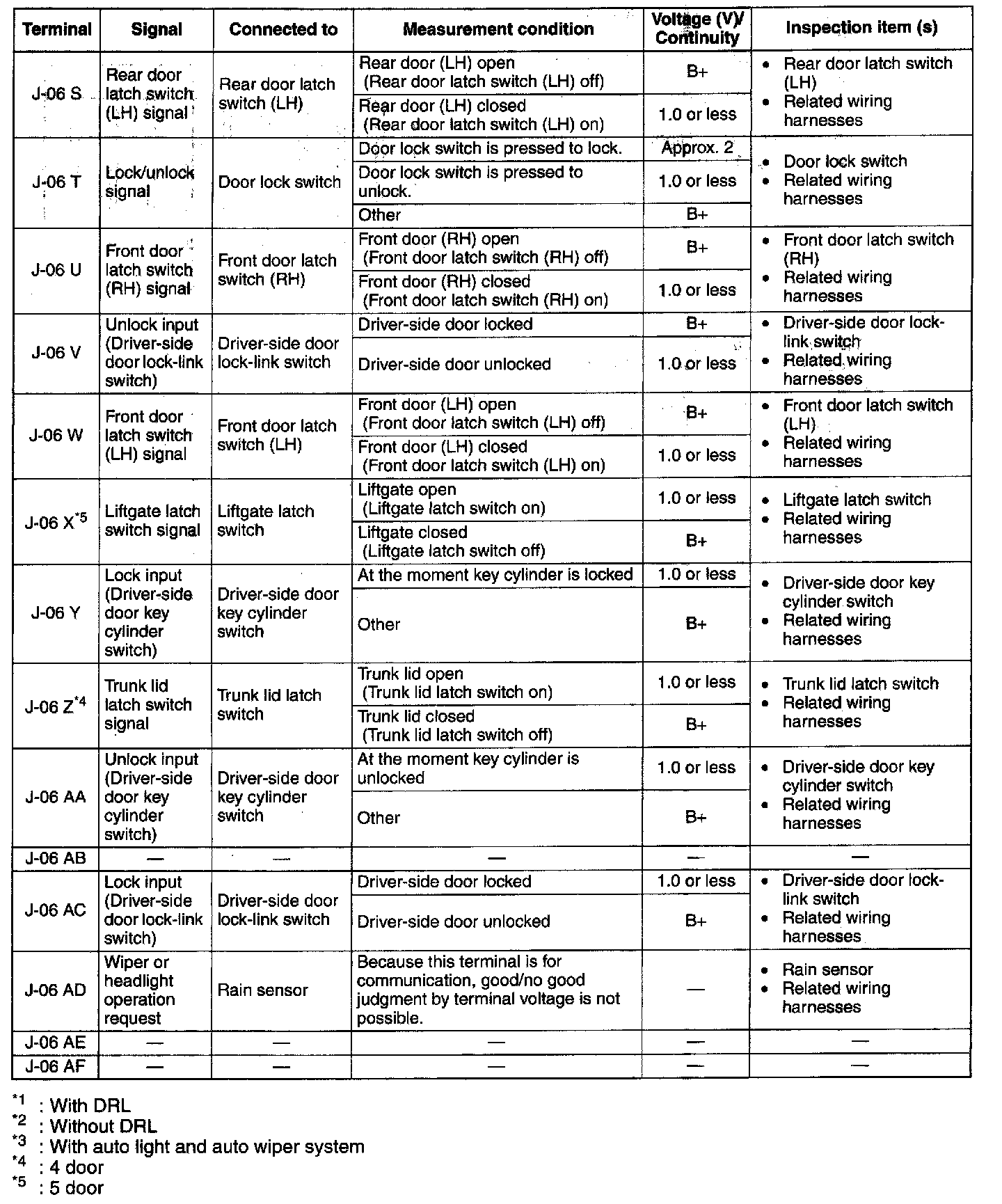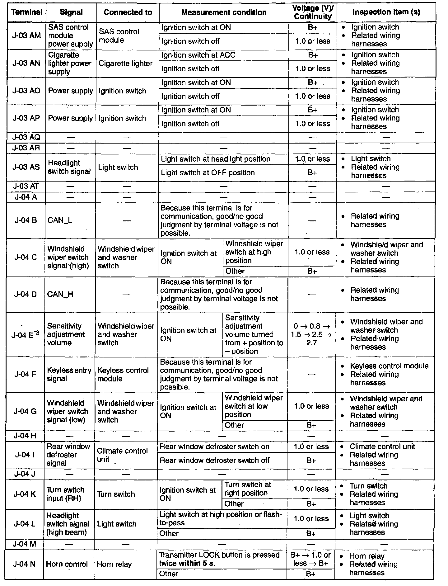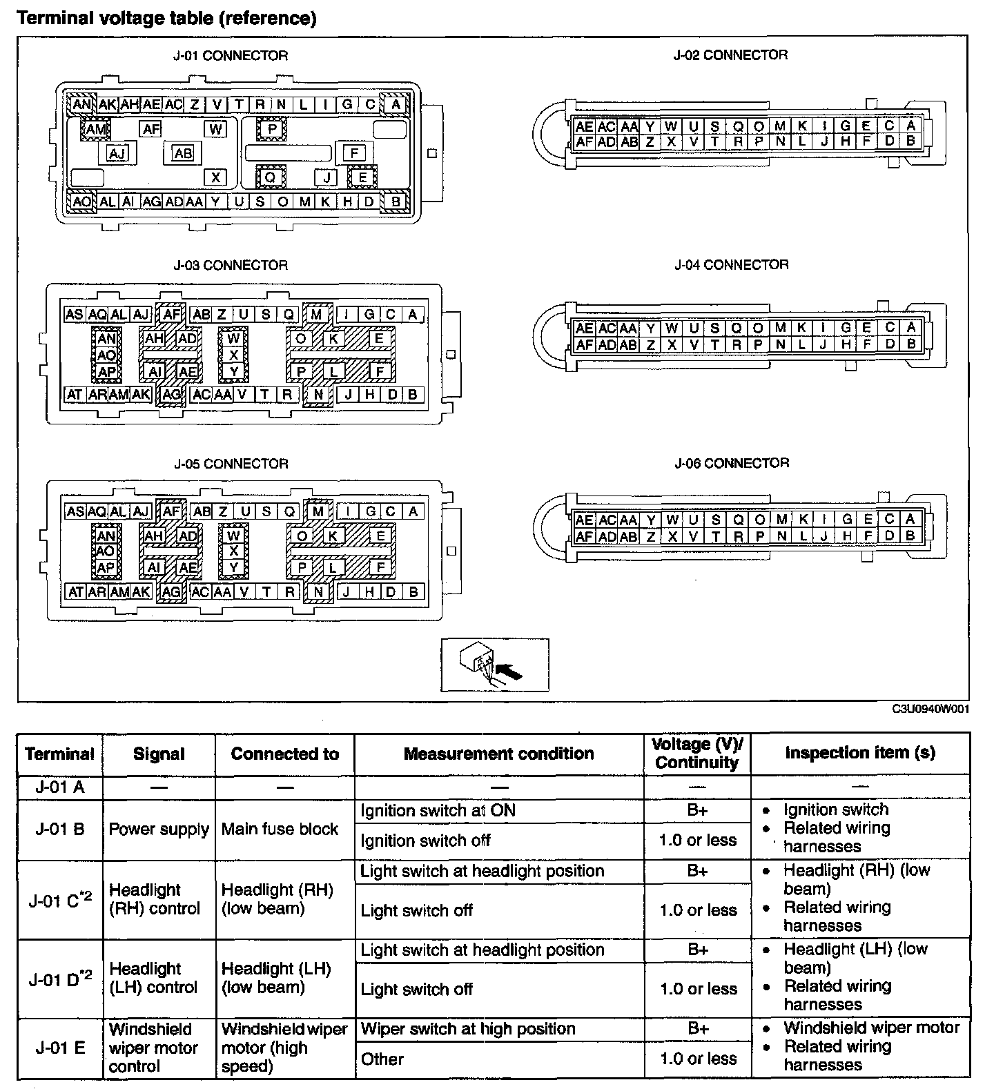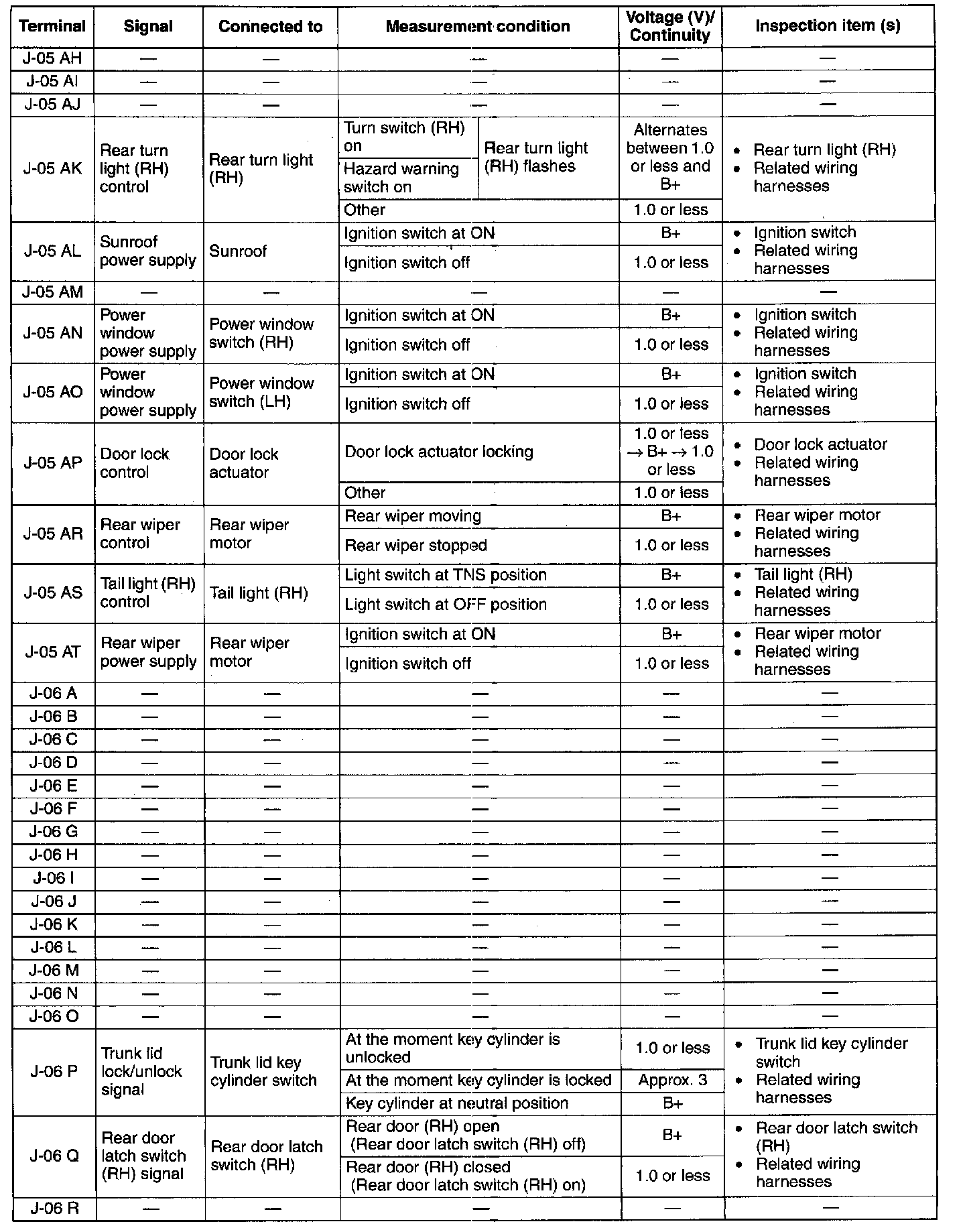 - If the voltage or continuity is not as specified in the Terminal Voltage Table (Reference), inspect the parts under "Inspection item (s)".