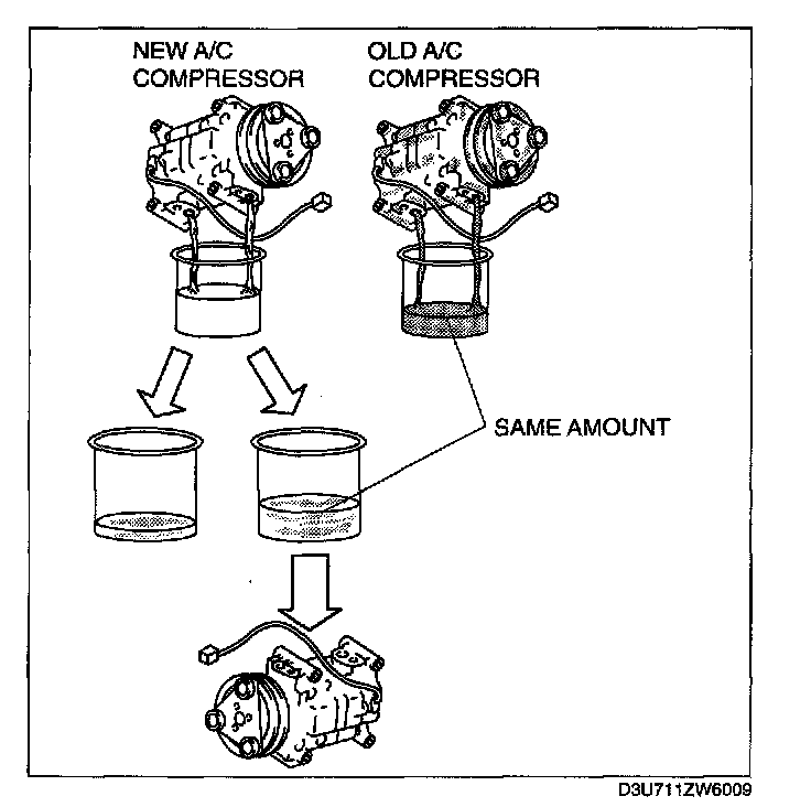 1. Rotate new A/C compressor shaft six to eight revolutions while collecting refrigerant oil in a clean measuring device. Use this refrigerant oil to refill new compressor. Do not allow refrigerant oil to become contaminated.