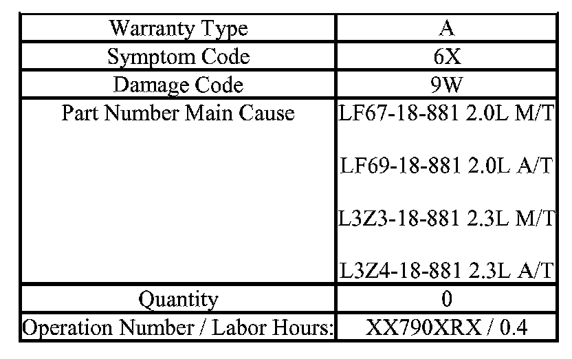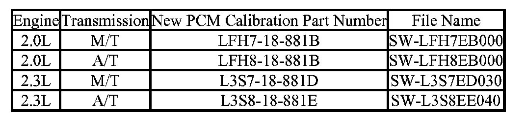 NOTE: The PCM Calibration Part Numbers listed above are provided for PCM reprogramming purposes only. These are not necessarily the same Mazda part numbers used to order an actual PCM through the Mazda Parts System. It is not necessary to order a PCM as part of this repair procedure.